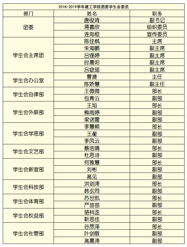 2018-2019学年团委学生会学生干部予以公布。名单如下: