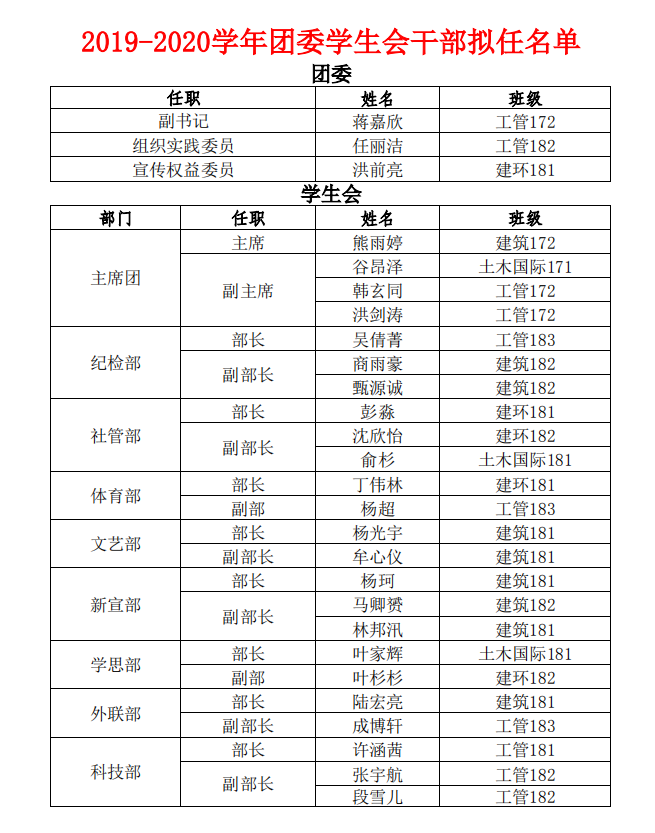 经竞职答辩,结合学院团委考核,现将嘉兴学院果冻传媒 2019-2020学年团委学生会拟任干部名单公布如下: