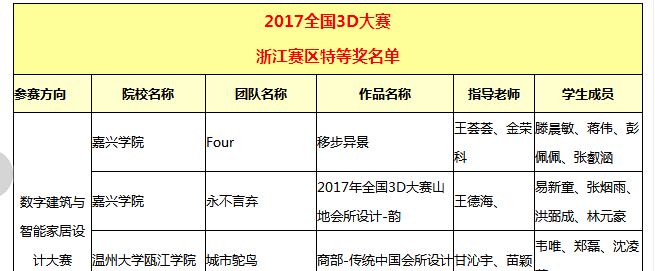 在2017年全国3d大赛浙江赛区决赛中取得大丰收,一共收获15组奖项。其中浙江赛区特等奖2项,浙江赛区一等奖4项,浙江赛区二等奖6项,浙江赛区三等奖3项。按照3D大赛要求,进入浙江赛区特等奖的2组作品将参加全国3d大赛总决赛。这2组作品分别是由学生滕晨敏、蒋伟、彭佩佩、张叡涵组成的“Four队”参赛的作品“移步异景”,指导教师为王荟荟和金荣科;另一组是由易新童、张烟雨、洪弼成、林元豪组成的“永不言弃”队参赛的作品“2017年全国3D大赛山地会所设计-韵”,指导教师为王德海。预祝进入全国总决赛的作品取得更好成绩。