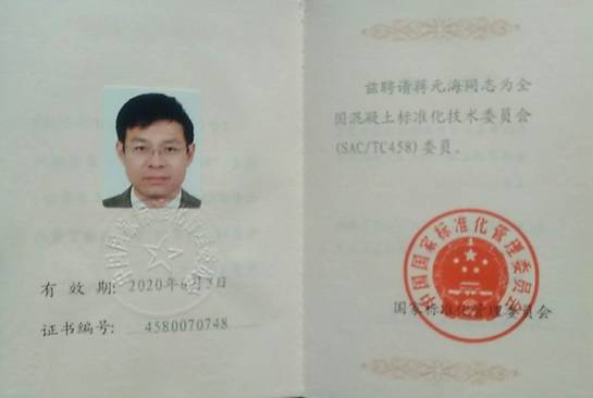 院长兼党委书记蒋元海教授收到国家标准化管理委员会颁发的“全国混凝土标准化技术委员会(SAC/TC458)”委员证书(证书编号4580070748)和“全国水泥制品标准化技术委员会(SAC/TC197)”委员证书(证书编号1970071655)。