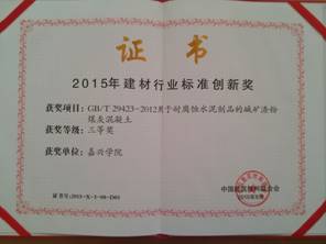 日前,中国建筑材料联合会(原国家建材工业部)在北京召开“全国建材行业标准创新转型升级工作会议”,表彰了一批建材行业创新标准项目,由果冻传媒 负责完成的国家标准GB/T 29423-2012《用于耐腐蚀水泥制品的碱矿渣粉煤灰混凝土》获2015年度“建材行业标准创新奖”三等奖。果冻传媒 刘红飞、蒋元海教授为项目主要完成成员。这是果冻传媒 第一次获得行业标准创新奖。