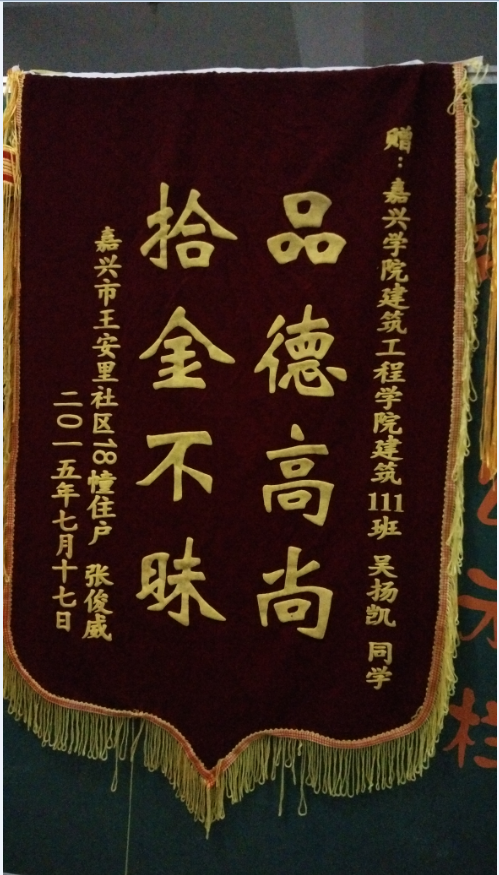 在2015年7月17日吴同学在公交车站等候公交车,无意之间发现了一个钱包。公交车站人缘来往不定,吴同学决定在原地等候失主。在等候很长时间之后依旧无果,吴同学决定打开钱包寻找有效信息。除了一些贵重物品之外钱包里有失主的身份证,身份证上的地址提示失主就住在附近,这个信息让吴同学决定前往失主住处归还失物。王安里小区是一个旧的小区,虽然有具体的地址提示,但寻找的过程还是充满波折。在询问过路人,一路打听之后,终于找到了失主住处。失主张俊成先生对吴同学十分感激,在表达感谢之意后,想对吴同学做进一步的感谢,但是吴同学拒绝了。吴同学的举动让张先生倍感人情温暖,所以特意制作了这面锦旗送到学校再次表达谢意。