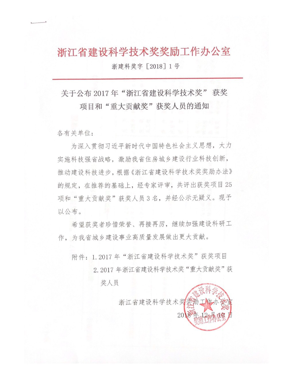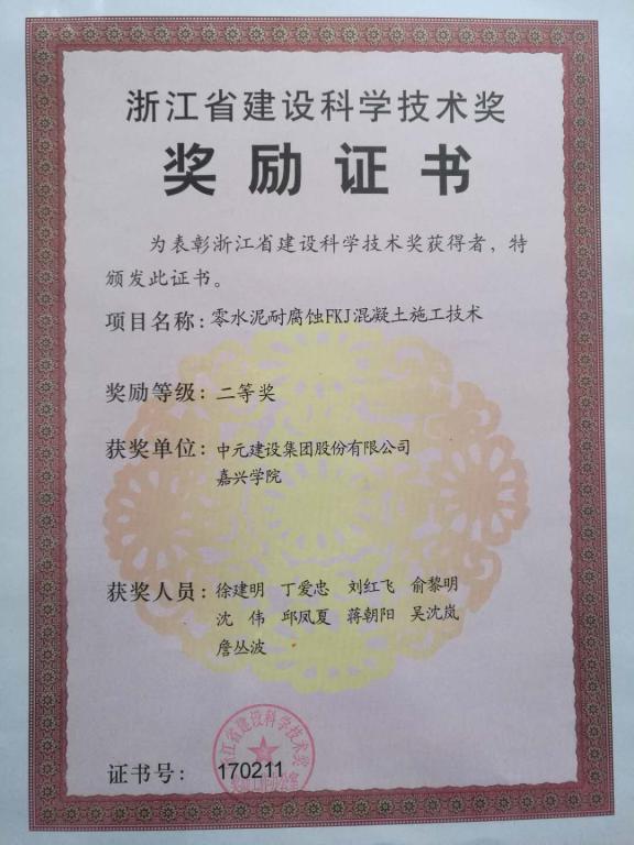 2017年度“浙江省建设科学技术奖”于2018年12月14日正式发布,共评出一等奖3个,二等奖11个,三等奖11个。中元建设集团股份有限公司和嘉兴学院共同完成的《零水泥耐腐蚀FKJ混凝土施工技术》项目获得二等奖。嘉兴学院果冻传媒
