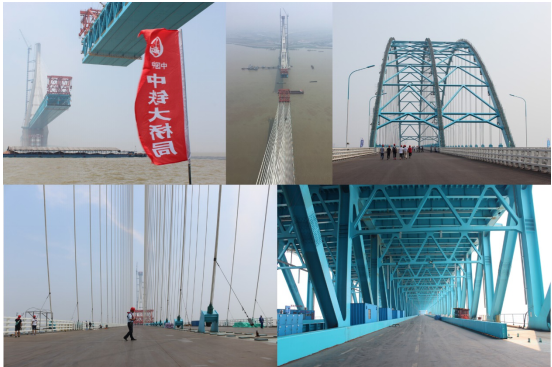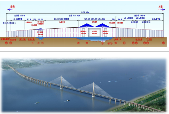 沪通长江大桥位于长江澄通河段,北岸为南通市,南岸为张家港市。大桥全长11076m,采用双线沪通铁路(设计速度200km/h)、双线通苏嘉城际铁路(设计速度250km/h)和双向6车道锡通高速公路(设计速度100km/h)共过江通道建设方式,其中公路与4线铁路合建段长6993m,大桥由主航道桥、专用航道桥、联络桥和南、北引桥组成,工程总投资150亿元,工期5年。大桥能抵御14级台风,8级地震,10万吨级船舶的撞击。主航道桥为双塔五跨连续钢桁梁斜拉桥,孔跨布置为(140+462+1092+462+140)m,采用三索面三主桁结构。具有“高、大、新”的技术特点。“高”,主塔高,主塔高325m,采用钻石型混凝土结构,为世界上最高斜拉桥主塔;“大”,跨度大、体积大,主跨1092m,为世界上跨度最大的公铁两用斜拉桥,沉井基础体积大,主塔墩沉井基础平面尺寸86.9*58.7m(12个篮球场大小),28#墩、29#墩沉井高分别为105m、110.5m,下沉深度达70m以上,是世界上体量最大、下沉深度最深的沉井基础;“新”,新材料、新结构、新设备、新工艺。采用Q500qE钢和2000MPa级斜拉索新型材料,主梁采用箱桁组合新型结构,伸缩量2m的钢轨温度调节器和梁端伸缩装置。