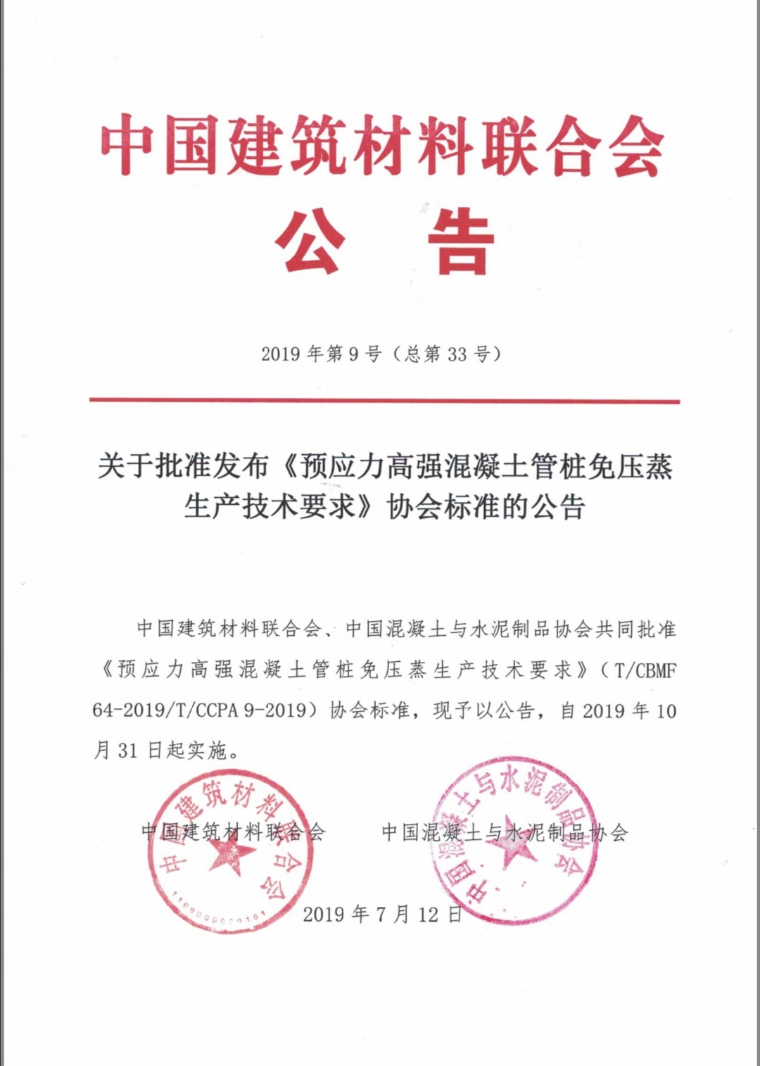 2019年7月12日,中国建筑材料联合会第9号(总第33号)文件“关于批准发布《预应力高强混凝土管桩免压蒸生产技术要求》协会标准的公告”,由嘉兴学院果冻传媒 负责起草的《预应力高强混凝土管桩免压蒸生产技术要求》(T/CBMF 64-2019,T/CCPA 9-2019)团体标准于2019年7月12日发布,将于2019年10月31日实施。