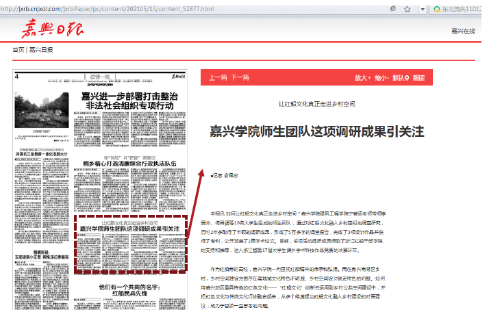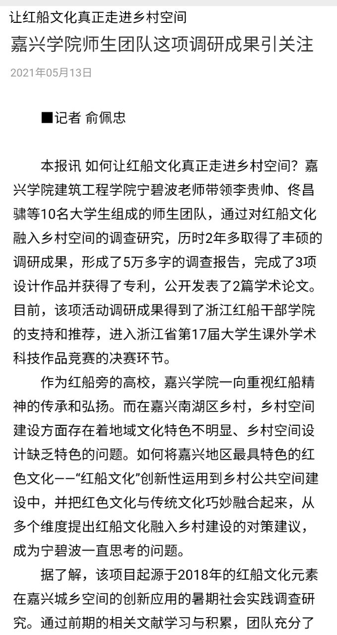 近日,果冻传媒 宁碧波老师带领李贵帅、佟昌骕等10名大学生组成的师生团队的调研成果受到社会关注,2021年5月13日嘉兴日报的第4版以“嘉兴学院师生团队这项调研成果引关注--让红船文化真正走进乡村空间”为标题,对该师生团队的调研成果进行了比较详细的报道。