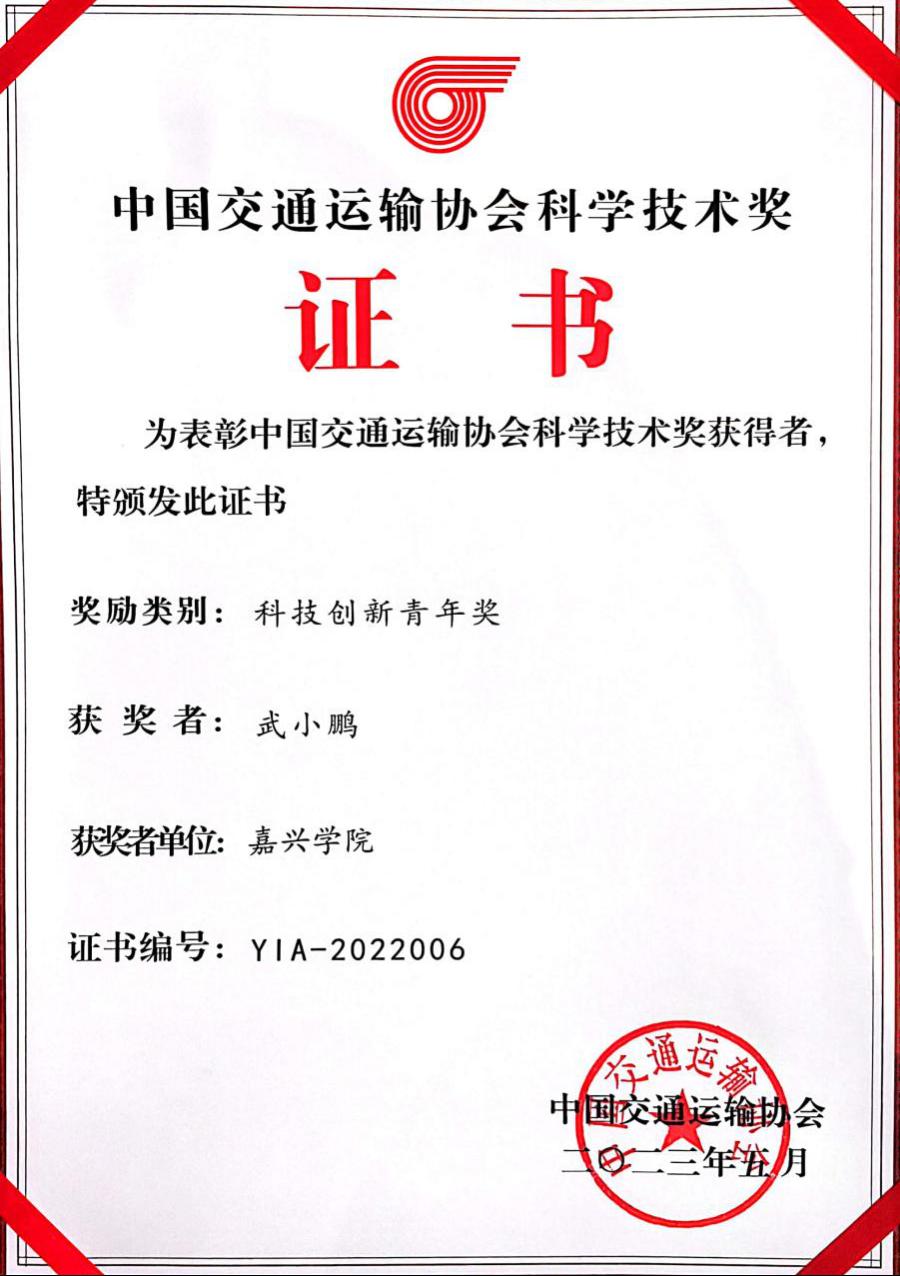 教授级高级工程师武小鹏荣获2022年度中国交通运输协会科学技术奖—科技创新青年奖。