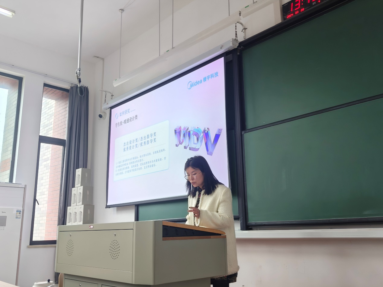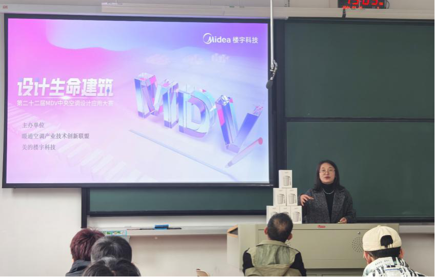 本次宣讲会旨在为学生提供一个展示自己设计能力、学习空调技术知识和应用的平台。活动中,来自美的楼宇科技杭州中心市场部推广经理王丽向同学们详细介绍了MDV大赛的赛制情况,为同学们如何报名参赛进行答疑解惑。