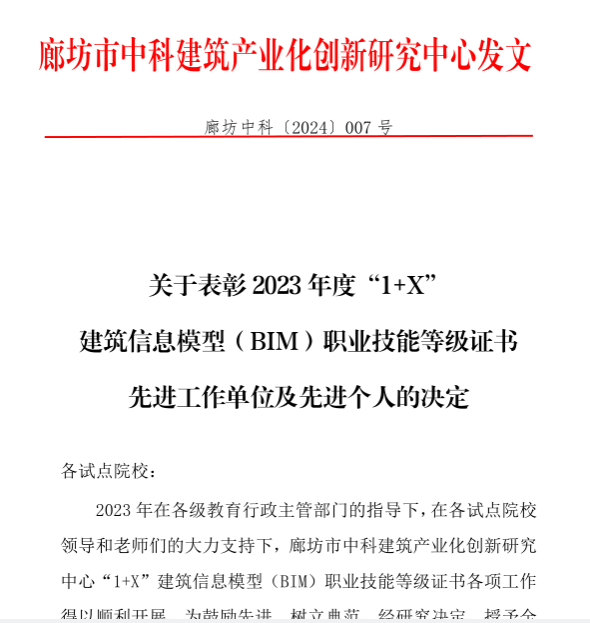 的“1+X(BIM)职业技能等级证书考核站点”荣获教育部2023年度"1+X"建筑信息模型(BIM)职业技能等级证书先进工作单位。廊坊市中科建筑产业化创新研究中心为教育部指定的“1+X”建筑信息模型(BIM)培训评价组织,近日发文授予果冻传媒