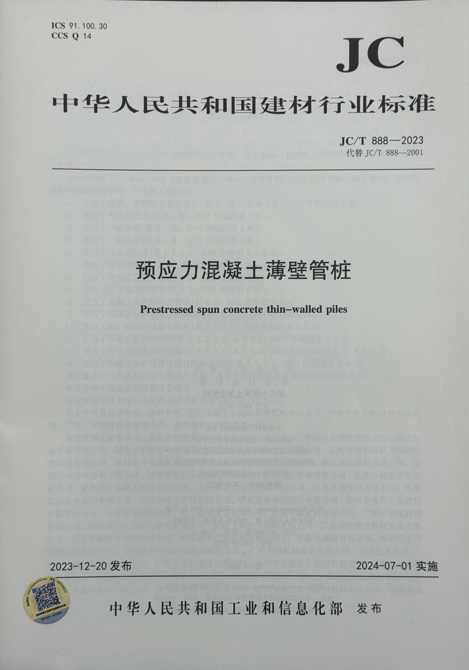 《预应力混凝土薄壁管桩》(JC/T 888-2023)建材行业标准针对预制混凝土桩产业和薄壁管桩行业发展的需要,进一步调整了预应力混凝土薄壁管桩产品分类、混凝土保护层厚度及外观等要求。为预应力混凝土薄壁管桩生产企业、施工企业以及相关从业人员提供了的质量控制标准,对我国预应力混凝土薄壁管桩的生产和推广使用具有十分重要的意义。