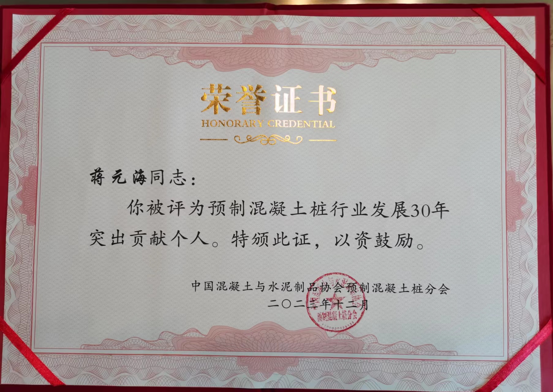蒋元海教授获得“预制混凝土桩行业发展30年突出贡献个人奖”。