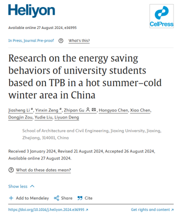 建环专业本科生在国际知名期刊《Cell》的子刊《Heliyon》(JCR1区,中科院3区,IF:3.4)发表了题为“Research on the energy saving behaviors of university students based on TPB in a hot summer-cold winter area in China”的研究论文。研究成果为建工学院太阳能热泵科研团队最新研究科研成果,果冻传媒