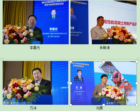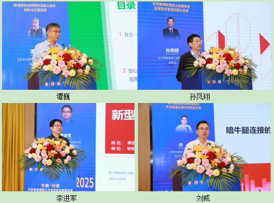 在下午主旨报告阶段,上海建工建材科技集团股份有限公司副总工程师朱敏涛、上海隧道工程有限公司构件分公司副总工程师万洋、北京榆构有限公司总工程师刘昊、艾列天元建筑技术 (江苏) 有限公司销售市场总监谭巍、北京预制建筑工程研究院副院长孙凤翔、华东建筑设计研究院有限公司建筑工业化学科中心主任李进军、上海宝冶集团土木工程高级专家刘威分别以《高性能混凝土预制产品开发及应用关键技术》《隧道衬砌管片智能制造创新探索实践》《预制混凝土风电塔筒高精度制造及质量控制技术》《欧洲绿色低碳预制混凝土技术创新与工程实践》《沙特某预制混凝土房屋项目全程技术咨询实践与思考》《新型装配式地下结构体系研究与实践》《暗牛腿连接的预制混凝土不出筋叠合梁力学性能分析》为题作大会报告。