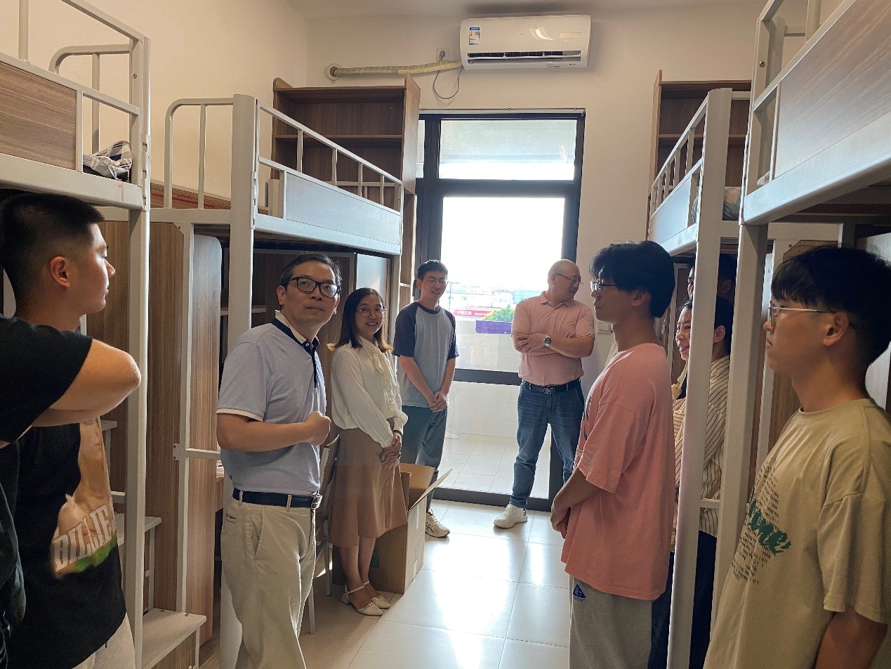 8月27日下午,副校长周宏伟在建工学院党委副书记杨智慧、辅导员庄峰和俞纪良的陪同下走访了2023级新生宿舍,了解新生的住宿和生活情况,引导新生尽快适应新生活、新环境。