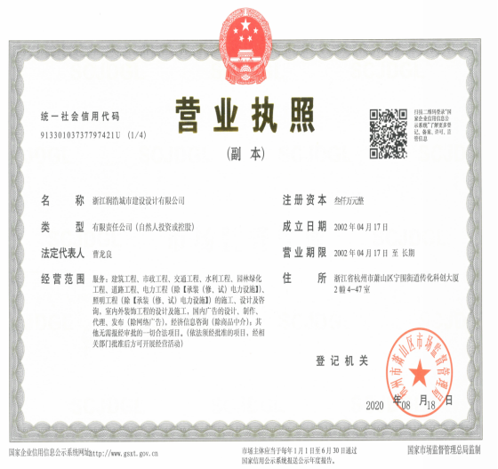 浙江润浩城市建设设计有限公司成立于2002年,历经近二十年的发展,目前颇具规模,开展主要业务方向是市政行业(道路工程)专业甲级;建筑行业(建筑工程)甲级;风景园林工程设计专项甲级;市政行业(给水工程、排水工程、桥梁工程、公共交通工程)专业乙级;公路行业(公路、交通工程)专业乙级。现有职工约280人,其中注册人员11名,高级工程师75名,中级工程师146名。