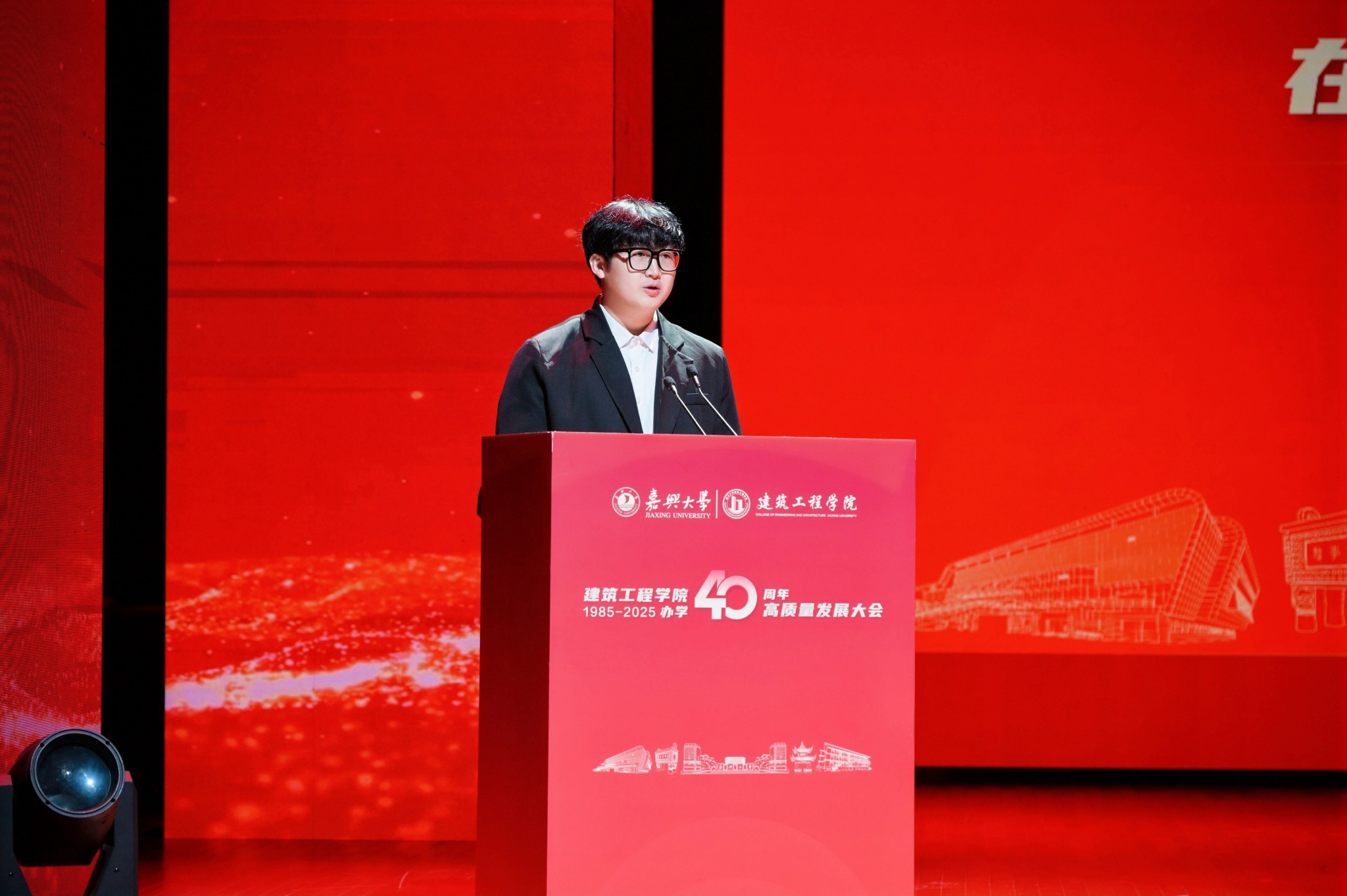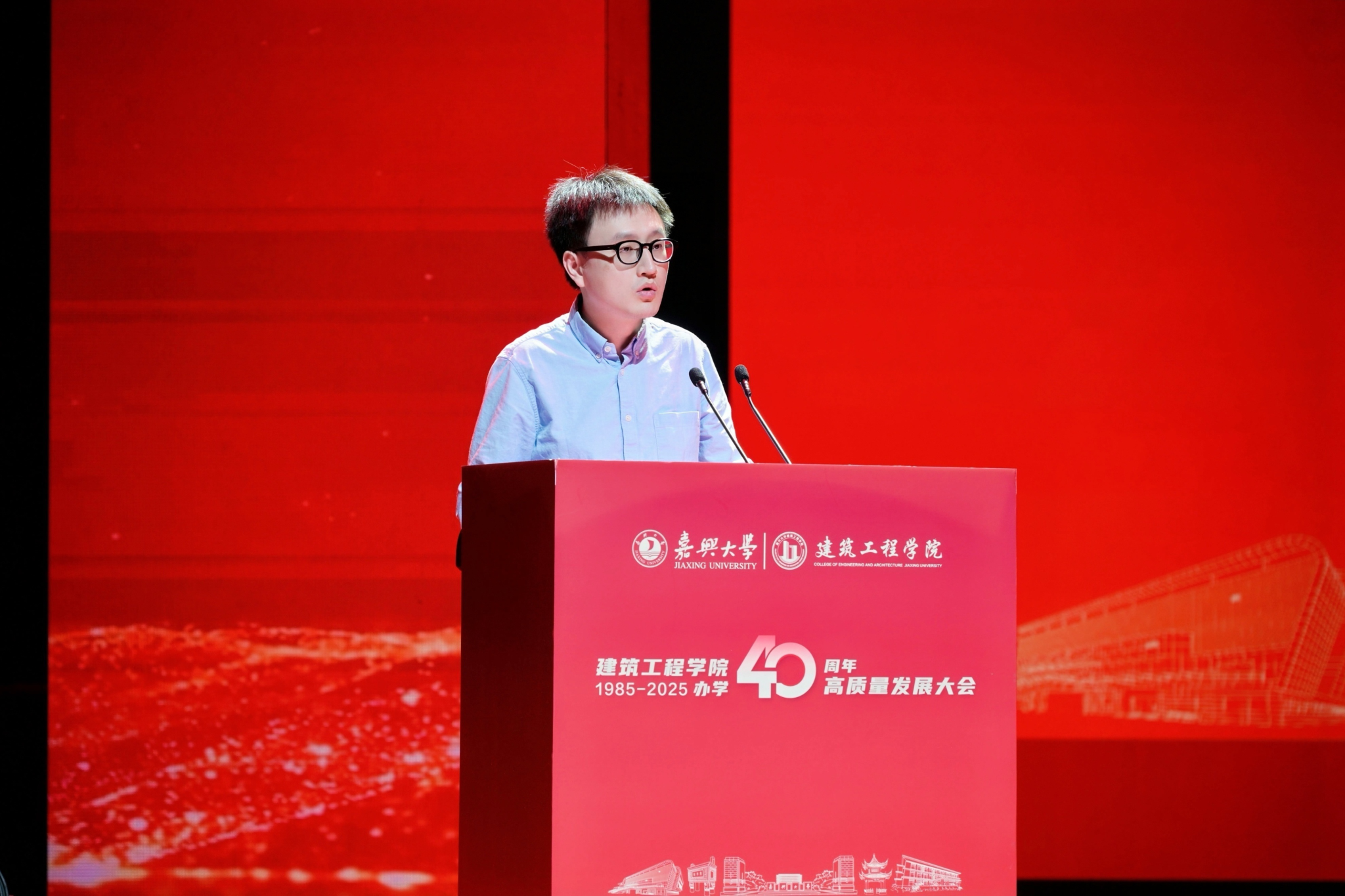 老教师代表马嵘老师讲述了他与建工的故事。他感慨道,当年的嘉兴高专土木系只有“房屋建筑工程”一个专科专业,100名左右在校学生。四十年转瞬即逝,如今已发展成为聚焦土木工程材料与结构、智能建造与工程管理、岩土工程、建筑节能技术及设计等研究方向,拥有“4本科专业 + 1硕士点”,在校生达1000多人的学院。他把嘉兴高专土木系比作绿皮火车,经过四十年的发展,经历了嘉兴学院机电与果冻传媒