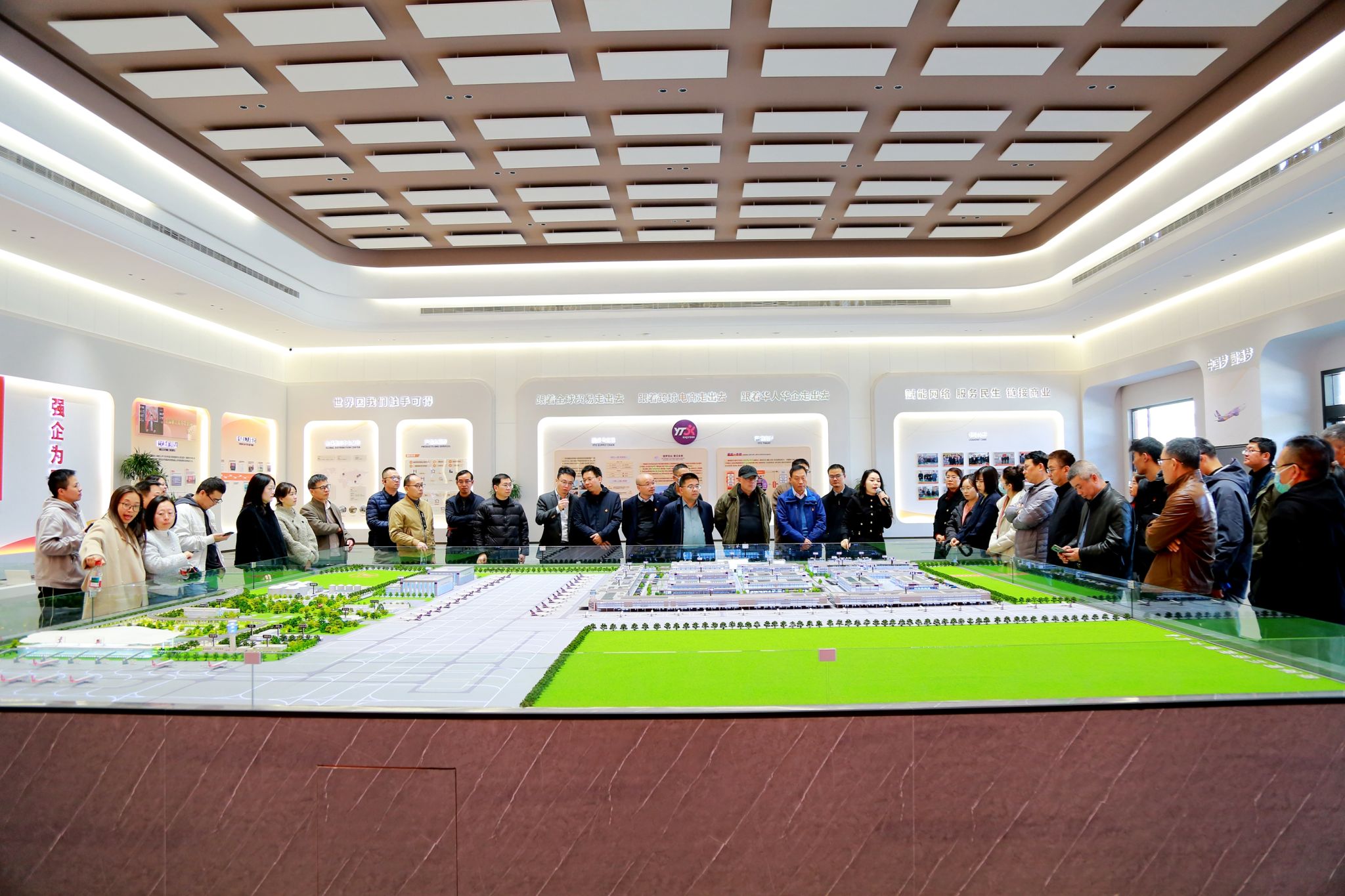 在学院党委书记童勇军、院长王恩茂等党政领导班子成员的带领下,党员们首先来到圆通东方天地港项目现场。这里是浙江省重点工程,也是全球瞩目的航空物流枢纽。党员们重点参观了圆通物流园、进口商品交易区以及正在紧锣密鼓施工的货物进口和出港海关节点。据现场负责人介绍,目前东方天地港正处于施工收尾与设备调试的关键阶段,多个单体建筑已进入最后冲刺期。