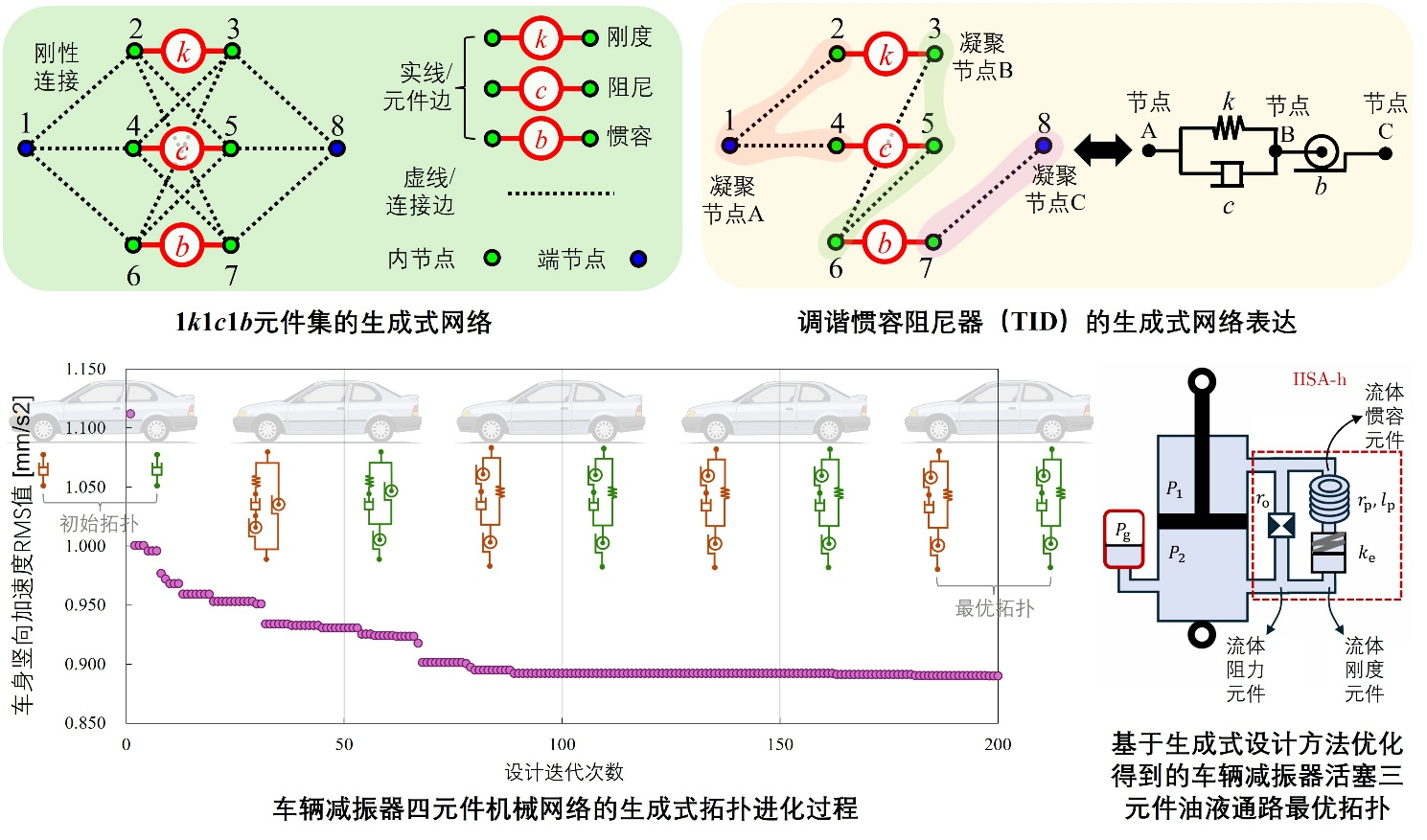 该研究针对多物理域减振装置的元件布局优化难题,创新性地提出了一种融合生成式振动控制网络与智能优化算法的设计框架。研究首次将减振装置的拓扑结构与元件参数设计统一约化为混合整数优化问题,并提出了基于Lévy飞行机制的蒙特卡洛随机搜索混合优化算法进行问题求解。该算法可在高维拓扑–参数空间高效寻优,有效解决了传统图论枚举式设计方法在元件数量增加时,因拓扑结构数量呈指数级增长而导致的寻优困难问题。此外,相较于遗传算法、粒子群算法及差分进化算法,以上优化算法在车辆及高层建筑用减振器的构型优化中表现出优异的全局搜索能力、收敛性与稳定性。以上方法可显著提升减振装置的优化设计效率,推动其设计由“经验驱动”向“模型驱动”转变,还为高维混合整数优化问题的求解提供了新思路。