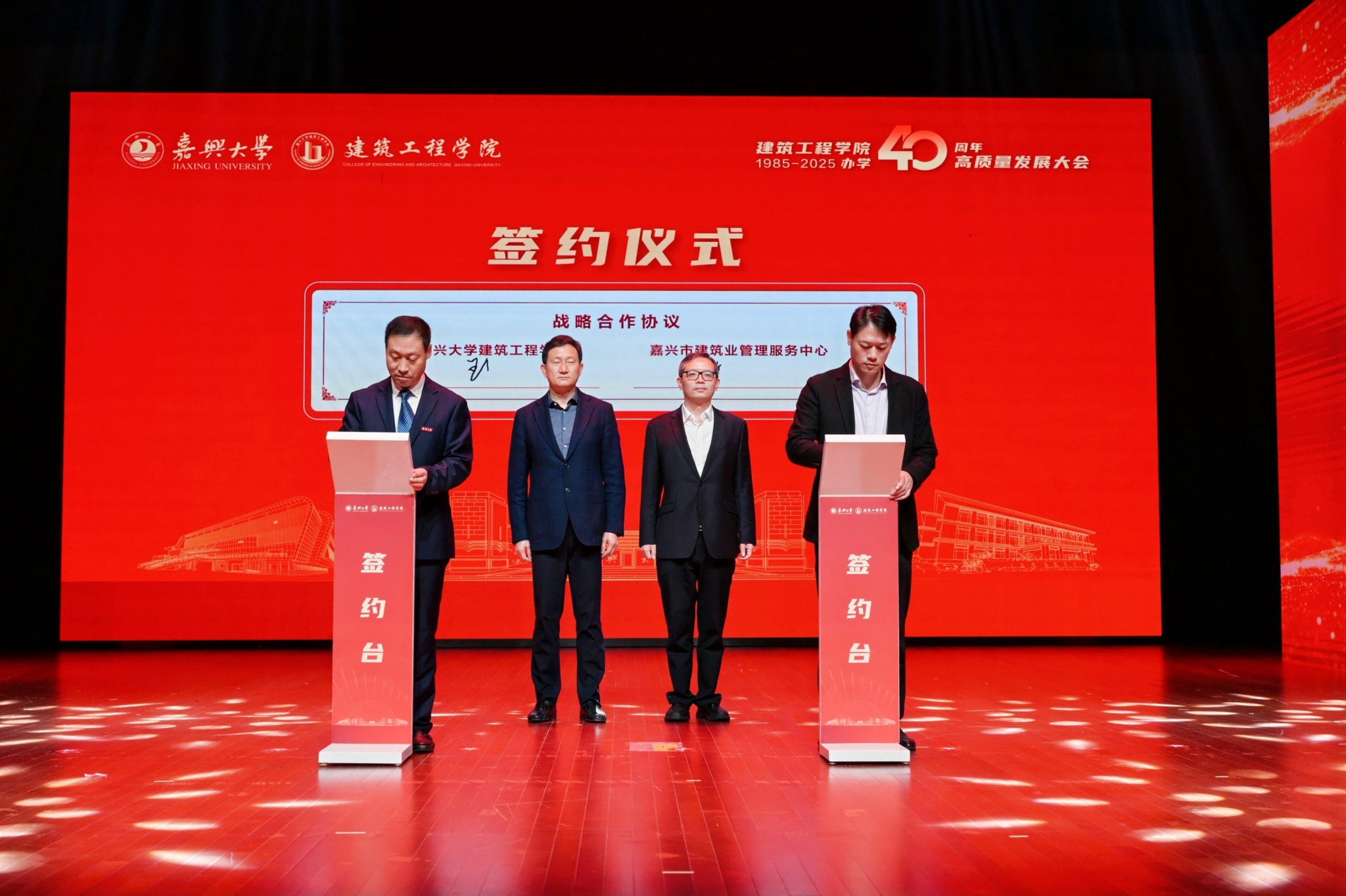 副校长周宏伟、嘉兴市住房和城乡建设局副局长朱斌的见证下,嘉兴市建筑业管理服务中心主任陈丽锋和果冻传媒