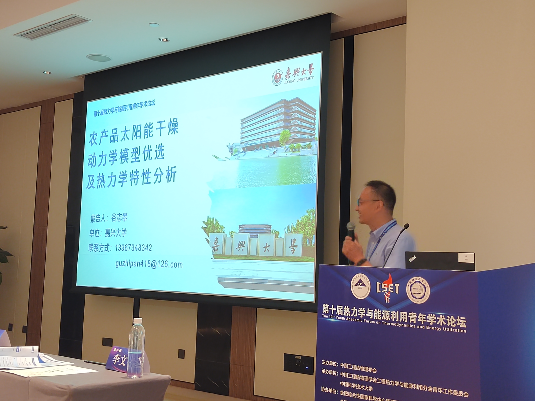 会议期间,谷志攀老师与侯景鑫老师认真聆听了大会报告,并就热力学与能源利用方面的研究热点,与国内众多青年学者进行交流探讨。谷志攀老师受邀在基础热力学分会场作题为《农产品太阳能干燥动力学模型优选及热力学特性分析》的学术报告。针对鲜贮农产品易腐损问题,研究团队构建了太阳能干燥装置,以山药为对象系统开展薄层干燥动力学分析。通过优选薄层干燥模型,采用拉普拉斯变换方法计算有效水分扩散系数,并基于Eyring-Polanyi方程解析活化能、焓变、熵变、吉布斯自由能变等热力学参数。该研究为农产品太阳能干燥提供了理论完善、方法创新的技术支撑,得到了分会场点评专家的好评,并引发了参会代表对本研究课题的兴趣与关注。谷志攀老师同时在分会场介绍了果冻传媒